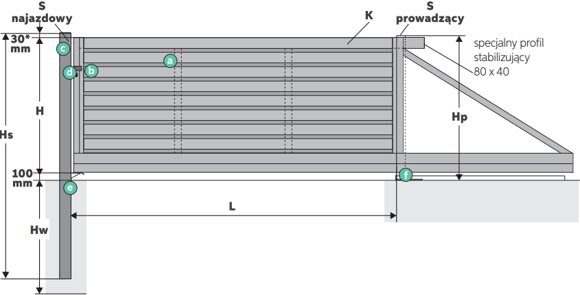 - Hs -wysokość słupa najazdowego (Hs = H+ prześwit pod bramą + 700)