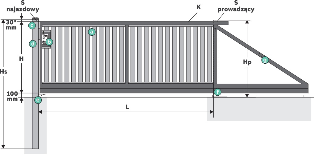 - (e) słup prowadzący 140 × 140 mm zakończony ostrzegawczą lampą LED z rolką prowadzącą oraz torem jezdnym z wózkami