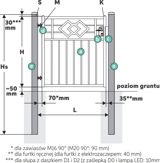 Wymiary zamówieniowe i ich oznaczenia potrzebne do prawidłowego doboru oraz montażu furtki: