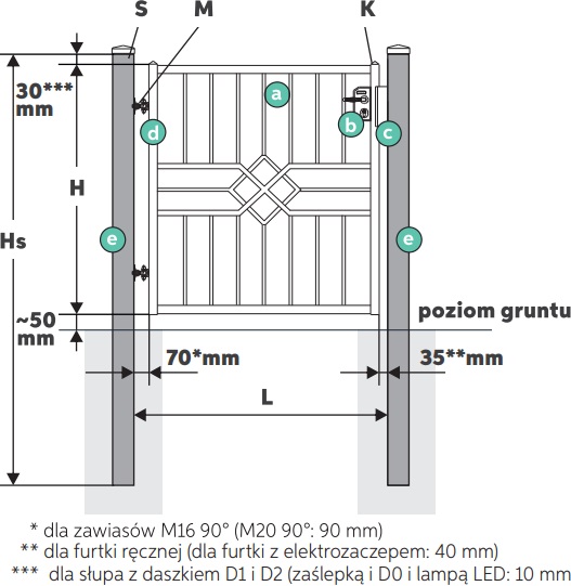 Wymiary zamówieniowe i ich oznaczenia potrzebne do prawidłowego doboru oraz montażu furtki: