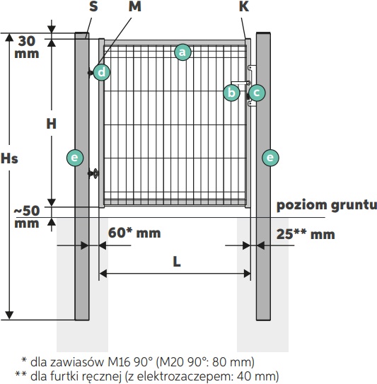 Wymiary zamówieniowe i ich oznaczenia potrzebne do prawidłowego doboru oraz montażu furtki: