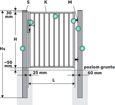 Wymiary zamówieniowe i ich oznaczenia potrzebne do prawidłowego doboru oraz montażu furtki: