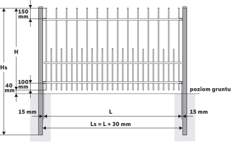 - wypełnienie: pionowe profile 15 × 15 mm w rozstawie 75 mm (± 2 mm)